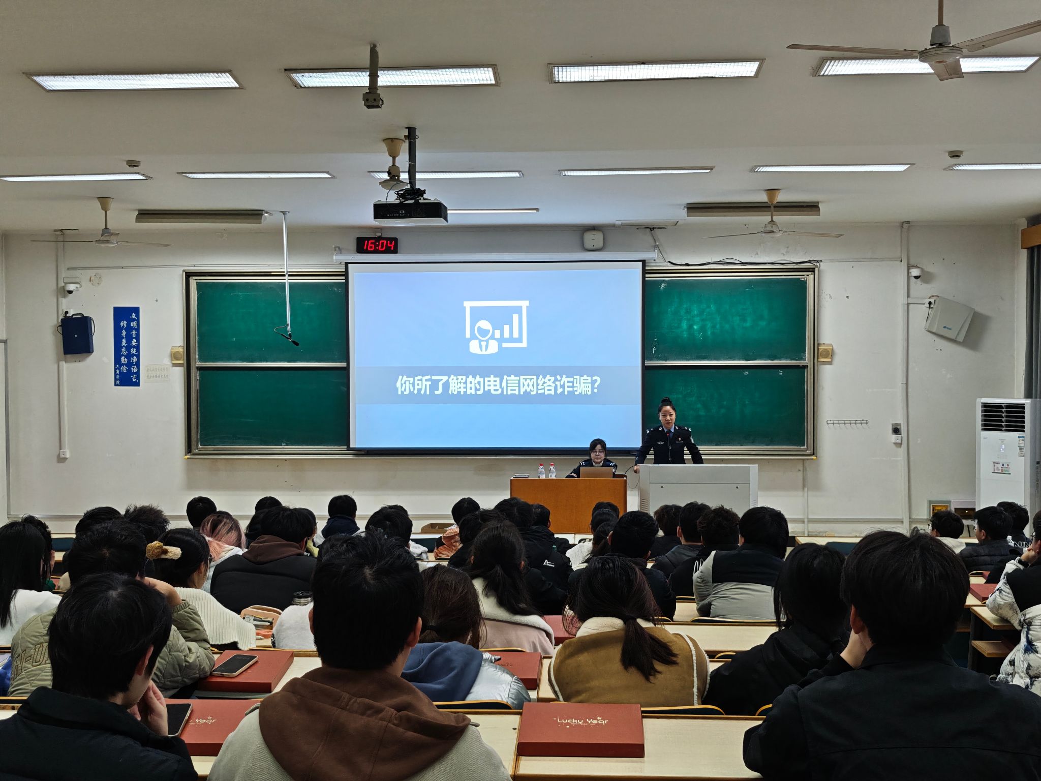 讲座中,姜警官通过展示反诈PPT、以案释法、防诈问题问答、发放反诈宣传册等多种形式,向大学生们详细讲解了当前电信网络诈骗常见类型和特点。针对高校大学生群体常见的校园贷、冒充熟人、兼职刷单、购买游戏装备等诈骗手段,姜警官结合实际案例,详细讲解该类案件的特点和预防方法。同时,姜警官还叮嘱学生要不断学习反诈知识,树立反诈意识,并呼吁大家将所学的防诈骗知识积极向身边人宣传普及,增强“亲友圈”“朋友圈”预防诈骗的防范意识,真正做到全民反诈。