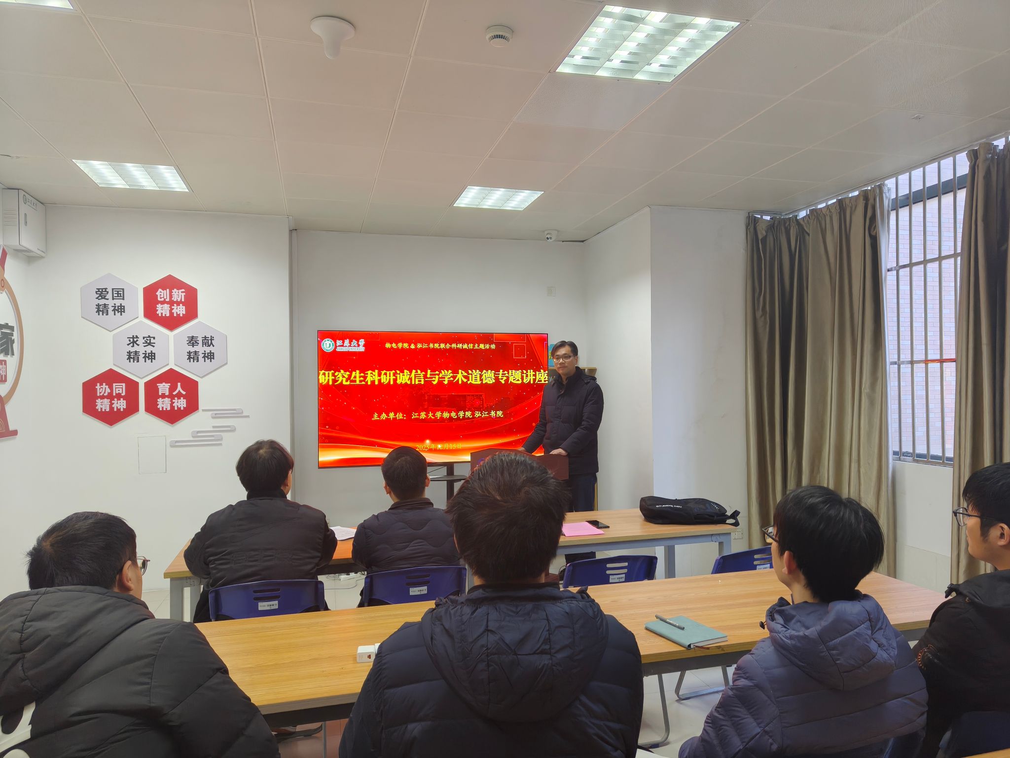 2025年12月15日,江苏大学物理与电子工程学院在泓江书院108会议室举办了“科研诚信与学术道德”专题讲座。物电学院副院长孙宏祥教授、辅导员杨伟伟、泓江书院陈欢老师及书院研究生寝室长共同参加了本次活动。活动由杨伟伟主持。